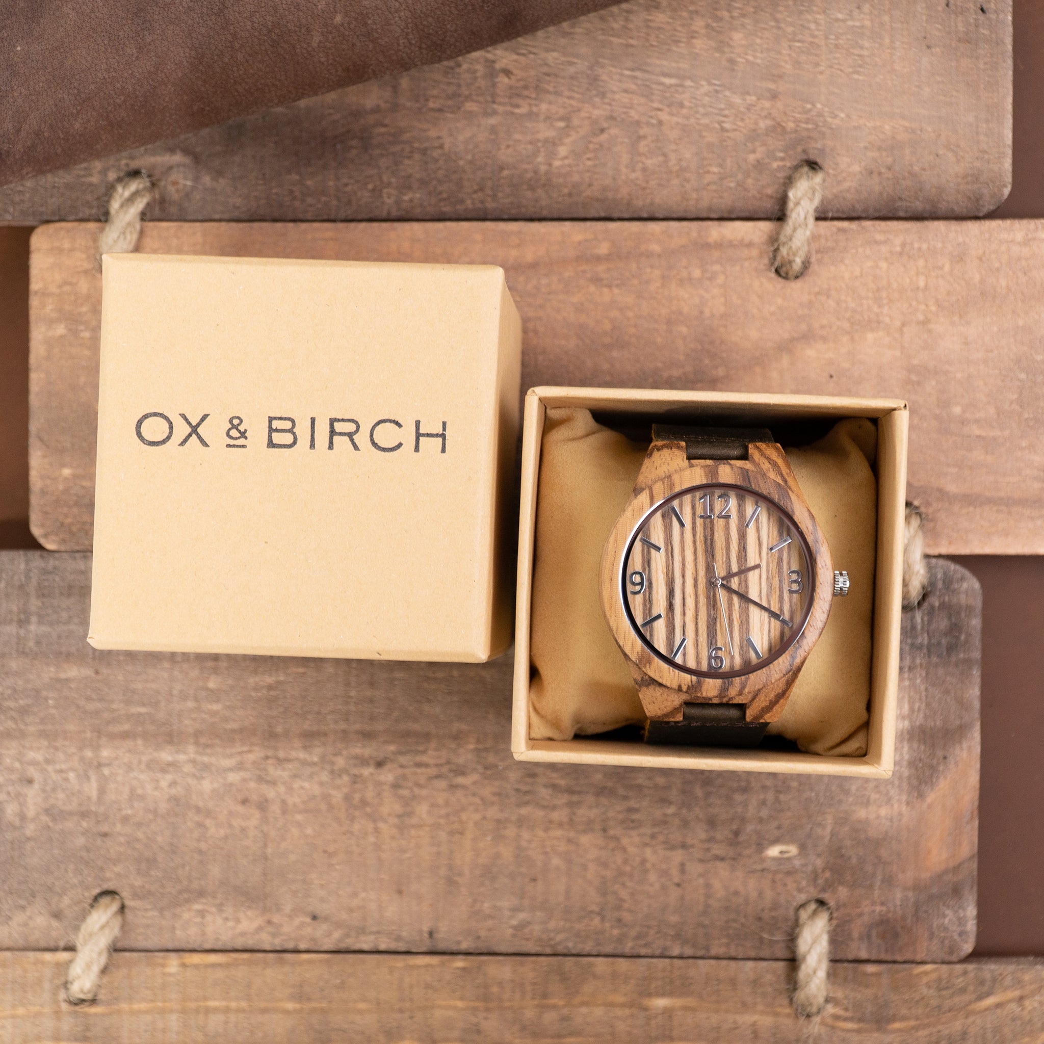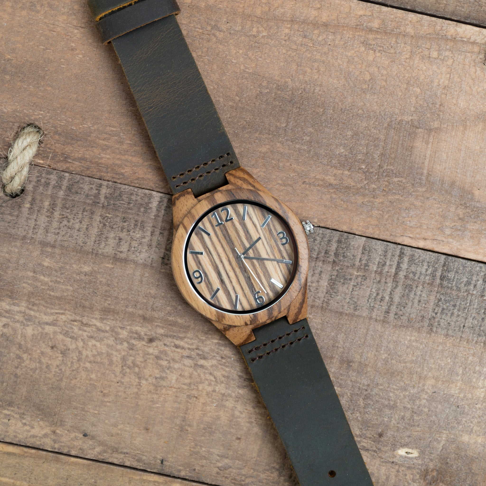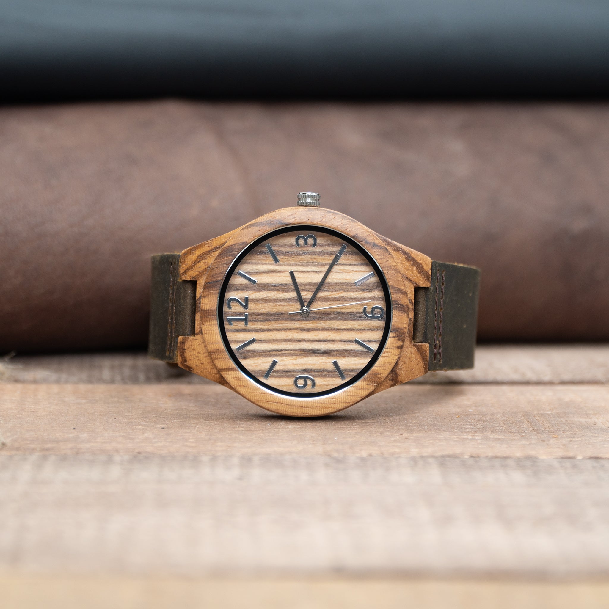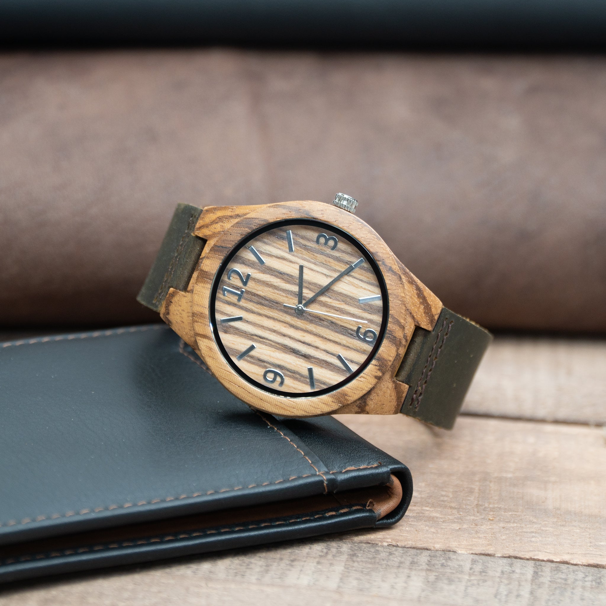 Wooden watch made from natural zebra wood and has a brown genuine leather band that is soft and comfortable. Silver minute markings and hands.