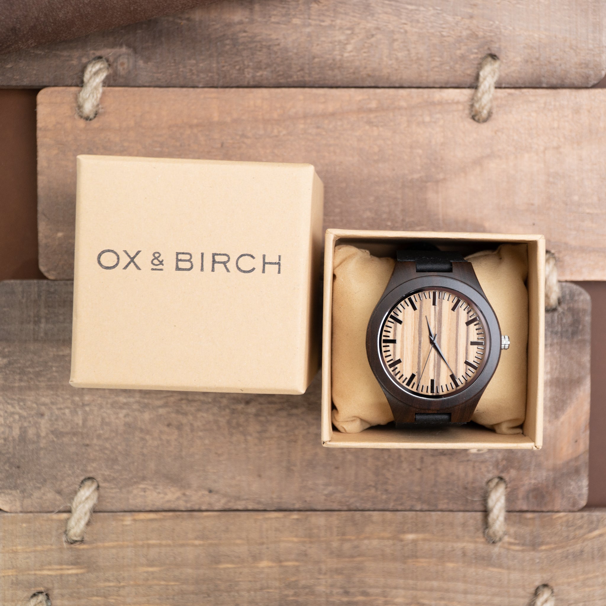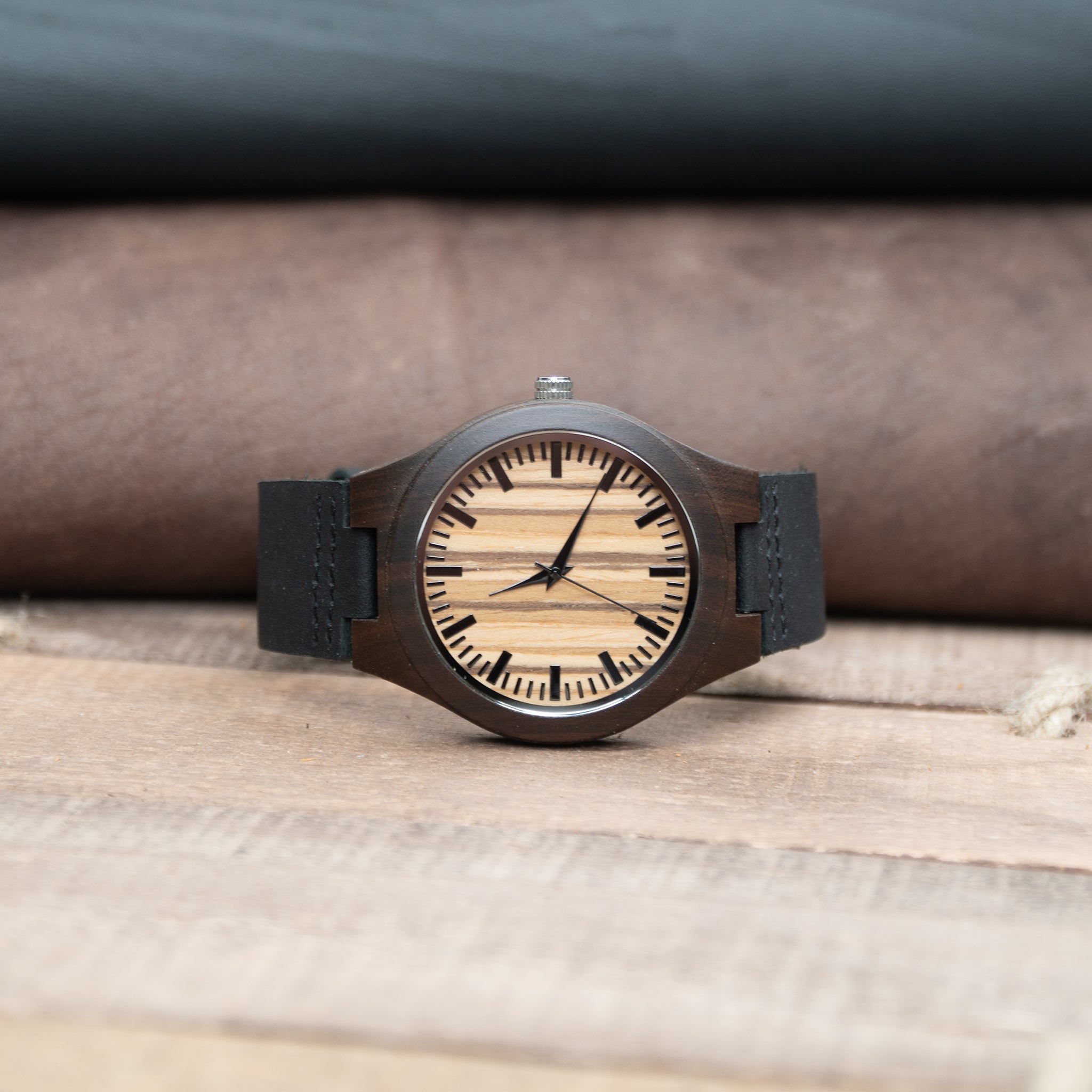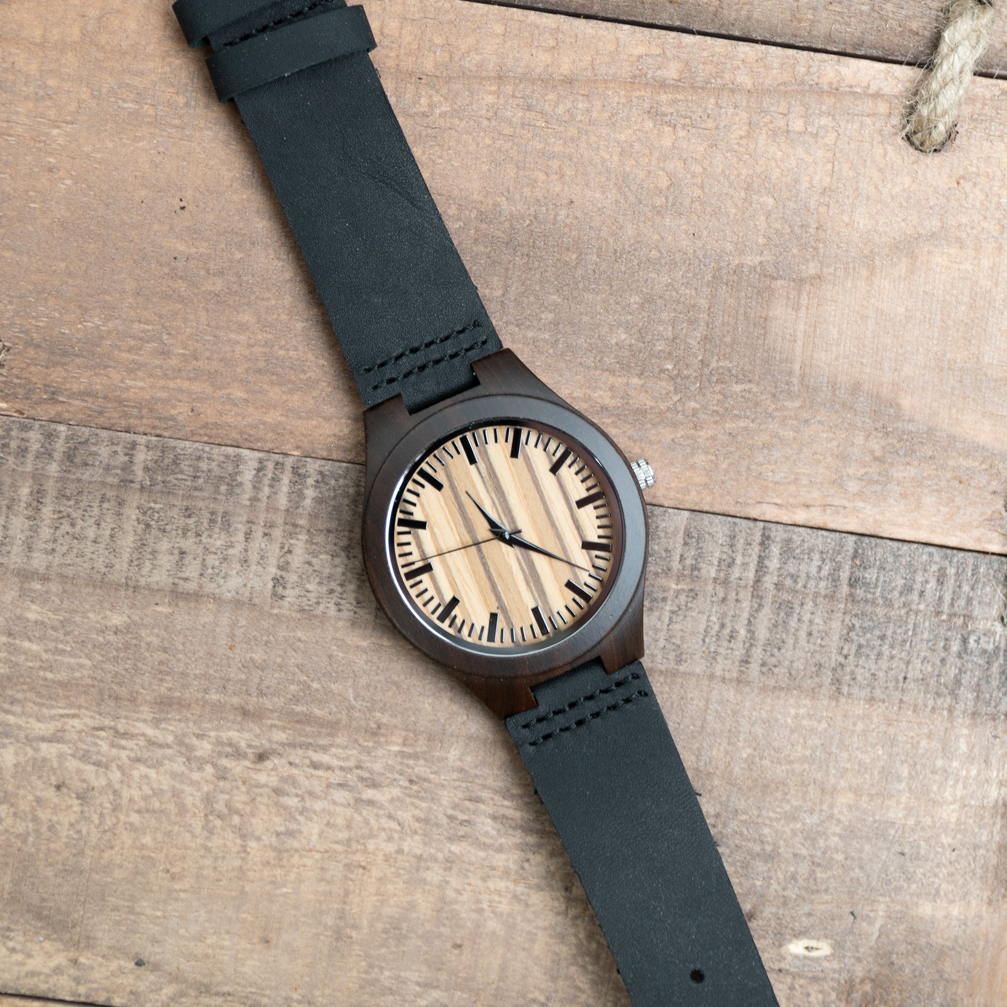 Wooden watch made from natural zebra wood and has a brown genuine leather band that is soft and comfortable. Silver minute markings and hands.