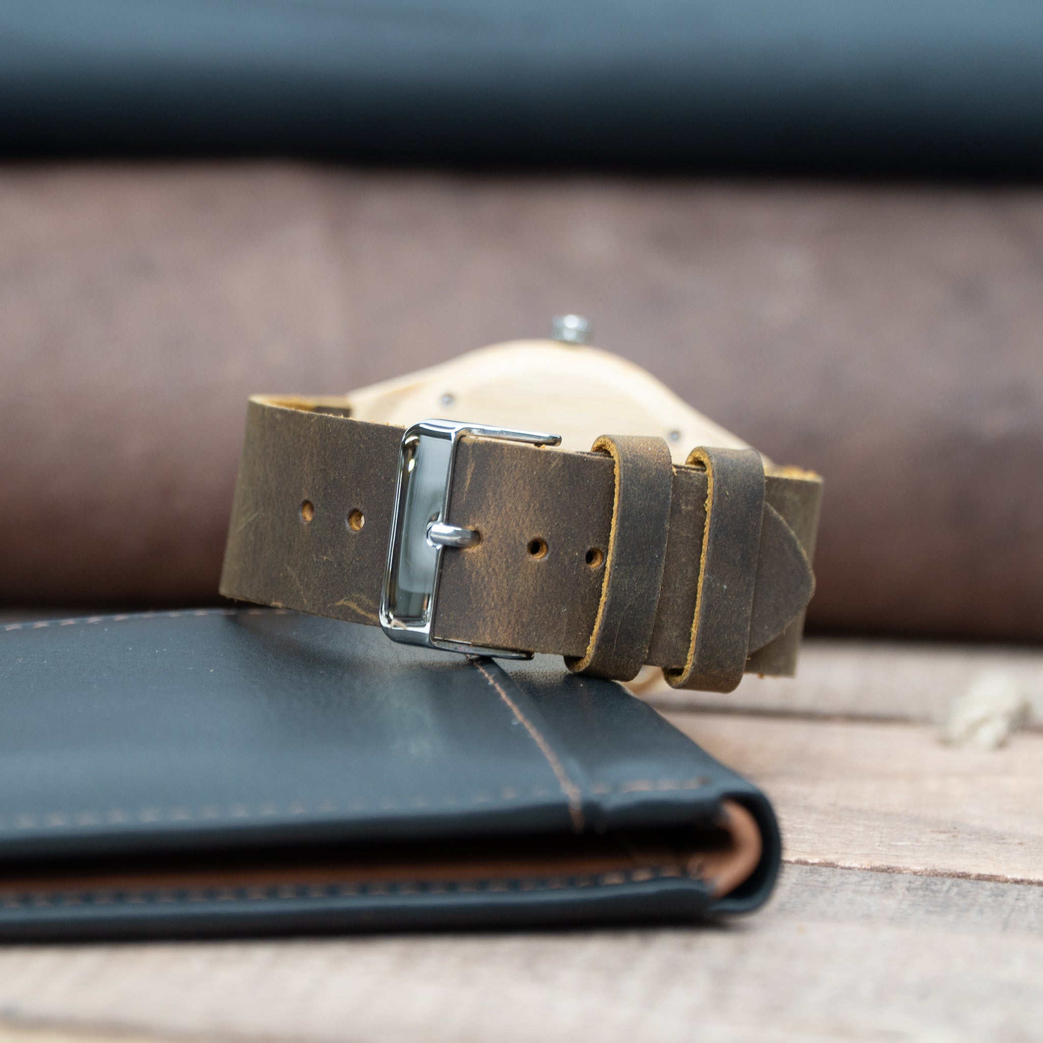 Bamboo Wood watch made from natural wood and has a dark brown genuine leather band that is soft and comfortable. This minimalist watch is accented with a green second hand that complements the black and white hour and minute hands.